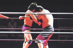 リングに戻るとエルボー打ち合い(左写真)、石川ニーリフト、カウント2。