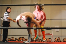 ケニーがイスを振り上げる、ディーノはかわしてスイちん(右写真)、イスをリングに置くとケニーをそれに座らせる。