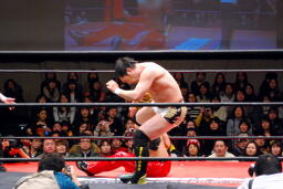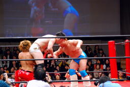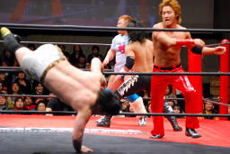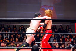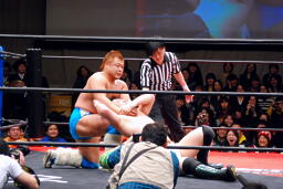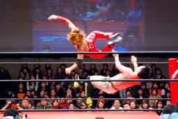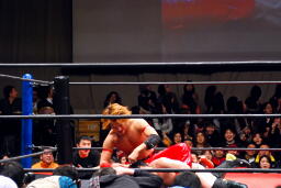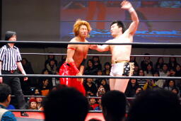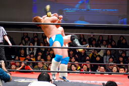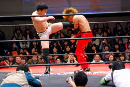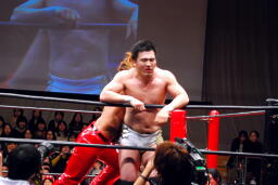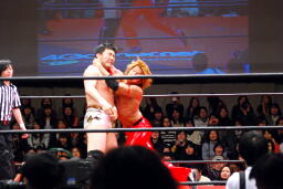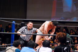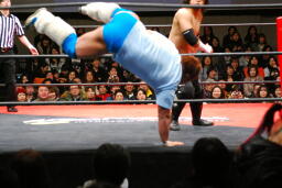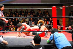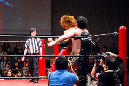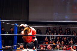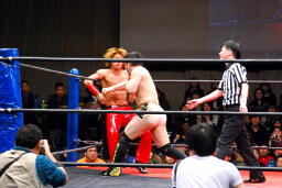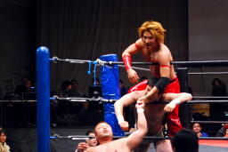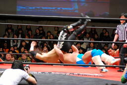 佐藤ハイキックからジャーマン(右写真)、カバーはカウント2。十字に行くが松永がカット。佐々木が松永を場外に。