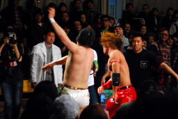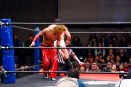 佐々木が止めに入るが佐藤は聞かず(右写真)、松永も蹴り飛ばす。ようやく復活した木曽レフェリーにハイキック、またダウンさせる。