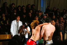 高尾と佐藤リングに戻る。エルボー打ち合い(右写真)。