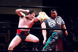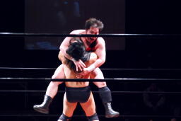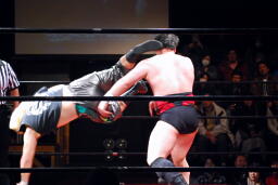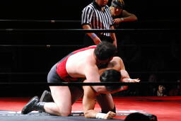 先発はアントンとGENTARO。ロックアップ、GENTAROヘッドロック、アントン腕を取って切り返し、バックに回るとフェイスロック(右写真)からフロントネックロック、