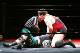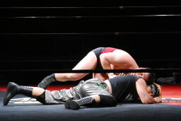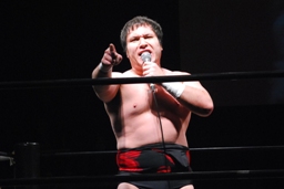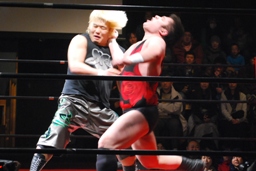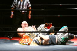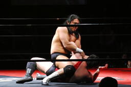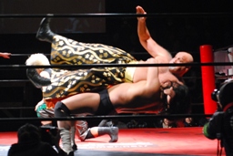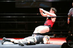 アントンパンチ、ロープに振る、GENTARO切り返すがアントンはテーズプレス(右写真)からフォアアームドロップ、ロープに飛んでニースタンプ。カバーはカウント1。星誕期にタッチ。