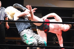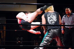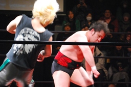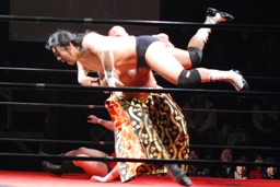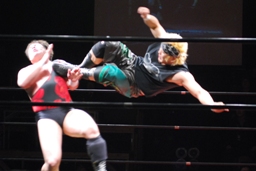 ウラノロープに振ってドロップキック(右写真)、GENTAROにタッチ。