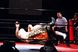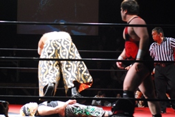 アントン入って串刺しラリアット、星誕期も串刺しラリアット。アントンロープに振ってスパインバスター、星誕期ボディプレス(右写真)、カウント2。アントンにタッチ。10分経過。