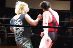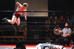 星誕期コーナースプラッシュ、DDT(左写真)、ボディプレス、カウント2。
