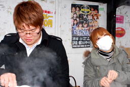 ニコニコカレー出張版を売る柿本大地・ドロップキック店長とチェリー・ニコニコカレー店長(左写真)。