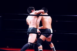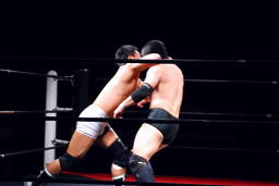ロックアップ、すぐにブレーク。妻木エルボー(左写真)、