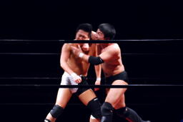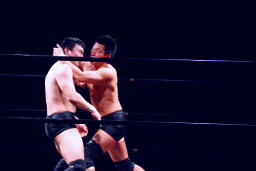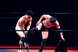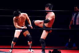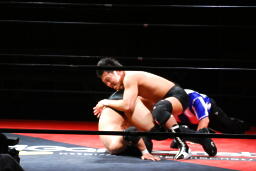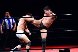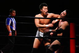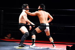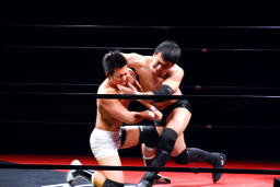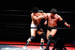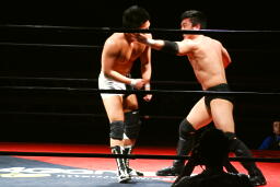 エルボーの打ち合い(左写真)、平田は逆水平。首投げからキック、ボディスラム、カウント2。さらにエルボードロップ、その場跳びのボディプレス、カウント2。5分経過。