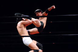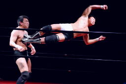 平田コーナーに上ってミサイルキック(左写真)、カウント2。