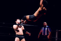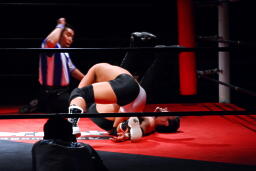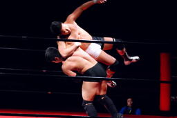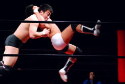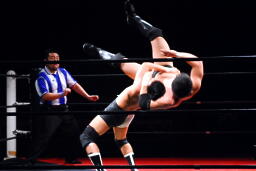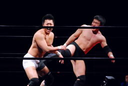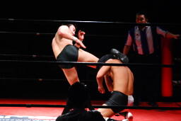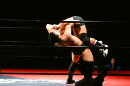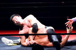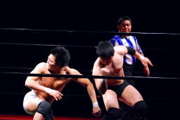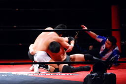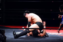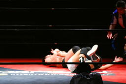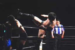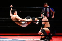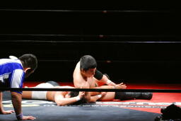 平田丸め込んで首固め、カウント2。スクールボーイ(右写真)、これもカウント2。