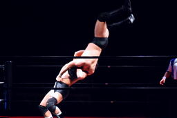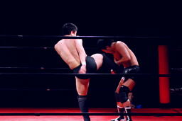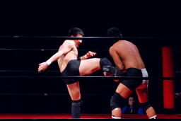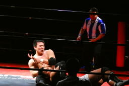 妻木ミドルキック、裏投げ(右写真)、カウント2。