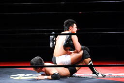 妻木ソバット、顔面キック、また腕にエルボースタッブ。ミドルキック連打(左写真)、ボディスラムからサッカーボールキック、カウント2。