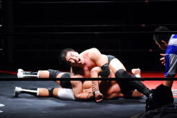 そして逆エビ固め(左写真)、妻木がロープに近づく、平田はリング中央に戻して逆片エビ、妻木なんとかロープに。