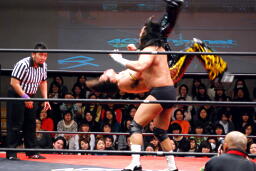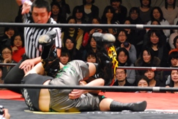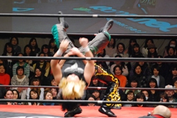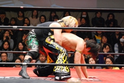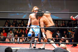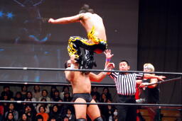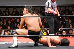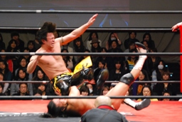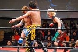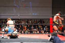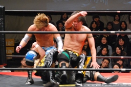 GENTAROクローズライン(右写真)、ウラノがジャックナイフで固める、カウント2。