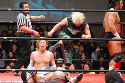 KUDO入ってカニばさみでGENTAROを倒し大石がフィストドロップ、KUDOキャメルクラッチに取って大石が顔面にドロップキック(左写真)。