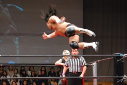 KUDOはGENTAROをコーナーに振って8×4、コーナーに上ってダイビングダブルニーアタック(右写真)、カバーはウラノがカット。10分経過。