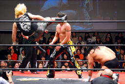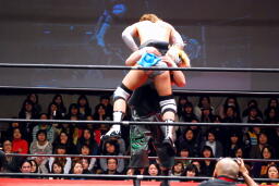 ウラノロープで顔面こすり、KUDOもエルボーで場外に落とす。ウラノ大石にフェースカット、ニースタンプ、カウント2。ロープに振ってマンハッタンドロップ(左写真)、トップロープに引っ掛ける。