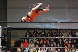 ダブルでロープに振ってパンチ。GENTAROボディスラムからコーナーに上ってローリングセントーン(右写真)、カウント2。ウラノにタッチ。