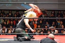 KUDOをリングに戻しGENTAROがダイビングボディプレス(左写真)。
