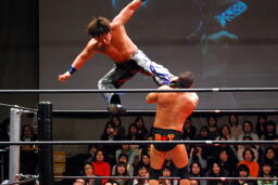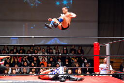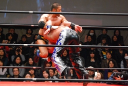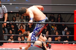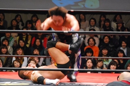 HARASHIMAボディスラム、エプロンに出てスワンダイブプレス、東郷はヒザを立ててブロック(左写真)。