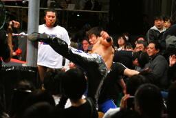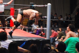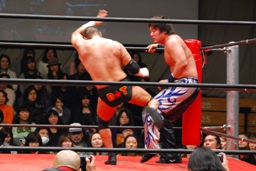 コーナーに上って「チェストー!」ミサイルキック(右写真)、カウント2。