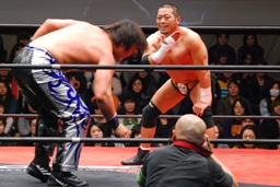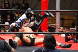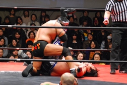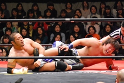 東郷はHARASHIMAをリングに戻すと足を踏みつけ。トーホールドからヒザ固めに(左写真)、HARASHIMAロープ。5分経過。