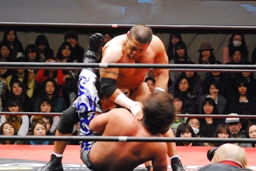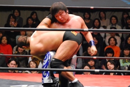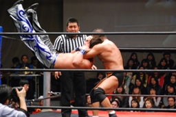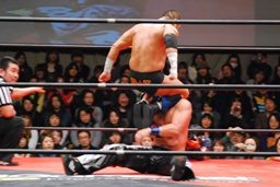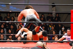 東郷ロープに飛ぶ、HARASHIMAカウンターのトラースキック。抱え上げてファルコンアロー(左写真)、カウント2。