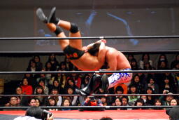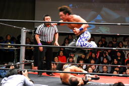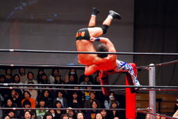 東郷ロープに飛ぶ、HARASHIMA追走してキチンシンク(右写真)。HARASHIMAストンピング、ロープに振ってキチンシンク、ボディスラムからギロチンドロップ、カウント1。