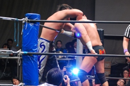 東郷低空ドロップキック、HARASHIMAエプロンにエスケープ。トップロープ越しにパンチとエルボーの打ち合い(左写真)、