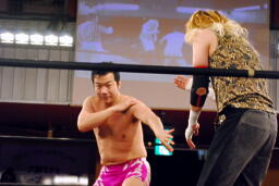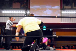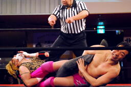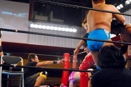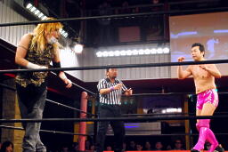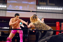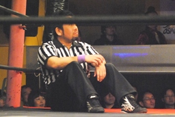 両者転がってロープに。そのままリング下に行こうとする動きを見せるが、松井レフェリー「ロープの上と下だから出ませんよー。」(左写真)そしてカウントを取り始める。