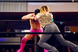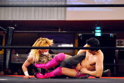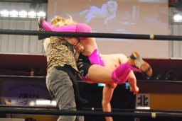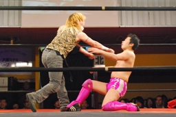 試合開始。まずはロックアップ(左写真)、ニラがヘッドロック。