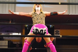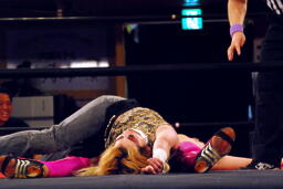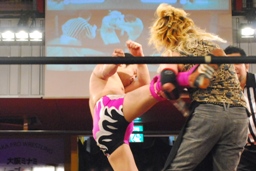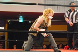 胴締めスリーパーに移行するとシットハート・ファウンデーションの3人が乱入(右写真)、松井レフェリーはためらいなく「ノーコンテスト!」