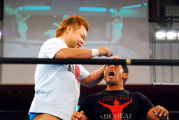 ニラはマイクを要求(右写真)。「おいなんだこの試合は!なんでお前の思惑に乗ってプロレスしなきゃいけないんだ!なあソルティ、お前もそうだろ!」塩田の方にマイクを投げる。塩田が拾おうとするとロケットパンチ。これは読めなかった。