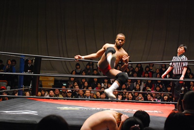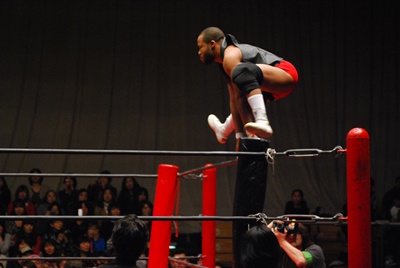 エプロンからディーノにキック、コーナーに飛び乗ってケブラーダ(左写真)。凄い。グレシャム場外で逆水平、鉄柱攻撃。