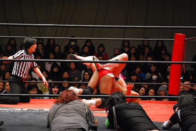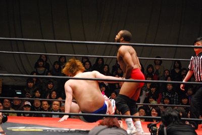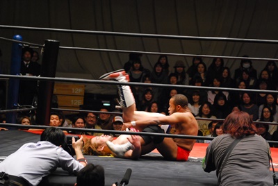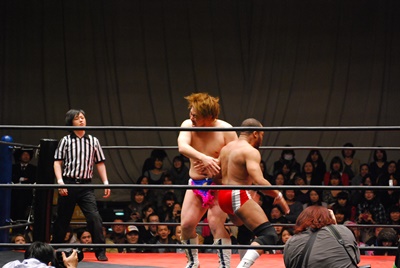 グレシャムスライディングから回転エビ(右写真)、カウント2。十字架固め、これもカウント2。