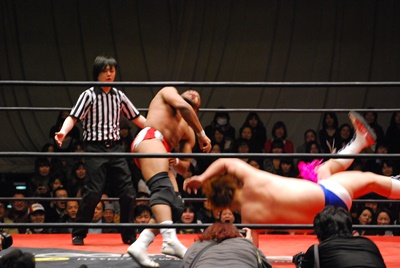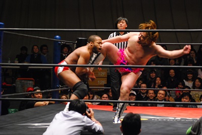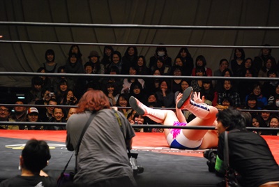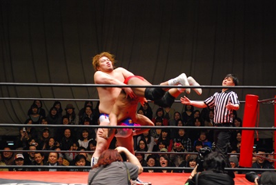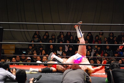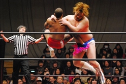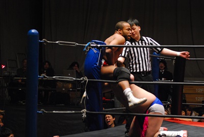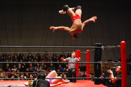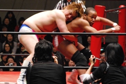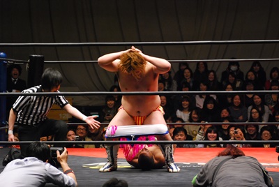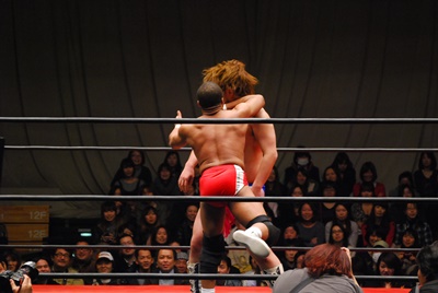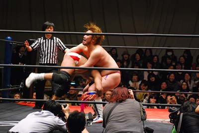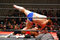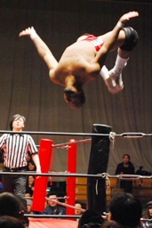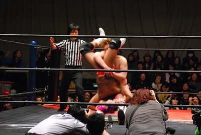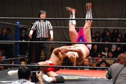 コルバタのような形で旋回して勢いを付けトルネードスープレックスに(右写真)、カウント2。小さいだけに技にもいろいろ工夫が。