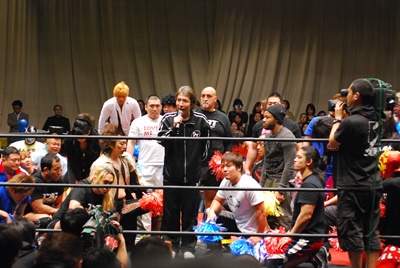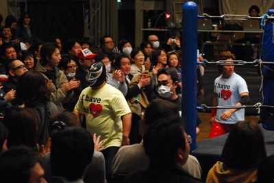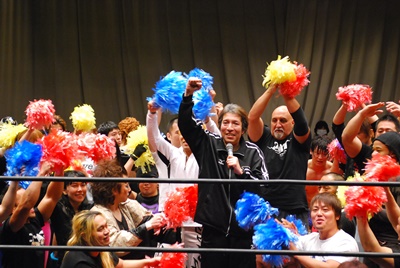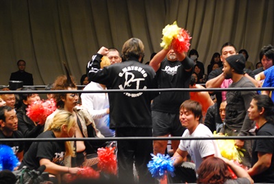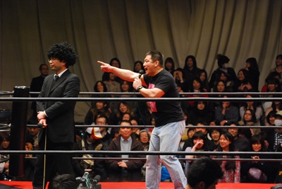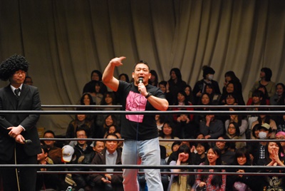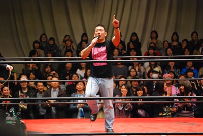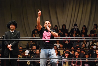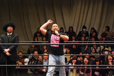 高木社長がリングに(右写真)。「DDTプロレスリング社長の高木です。本日は震災後、初の後楽園ホール大会にお越しいただきまして誠にありがとうございます。プロレスは夢と希望を与えるスポーツです。そのなかでもDDTは他と違ったやり方で幸せな空間を提供してきました。まだまだ復興に向けて不安は残っています。でも、不安を恐れていては何も生まれません。皆さんで一歩一歩、歩いて行きましょう。とは言っても、なかなかその一歩を踏み出すには勇気がいりますし、難しいこともあると思います。自分も昨日までは不安だらけでした。でも、今日集まってくれたお客さん、選手を見て、夢と希望が出てきました。一歩踏み出せるように、みんなで歌を歌いましょう!」へ?
