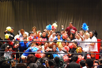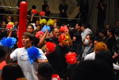 すると選手たちが両手にポンポン持ってリングサイドに(左写真)。