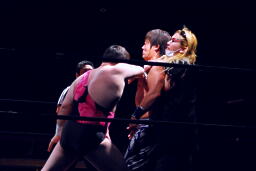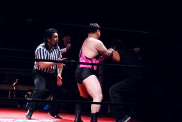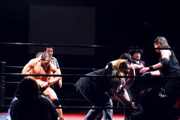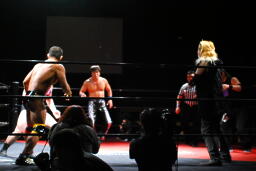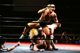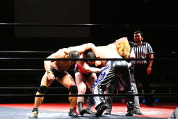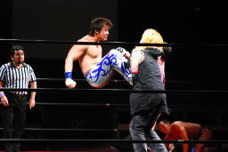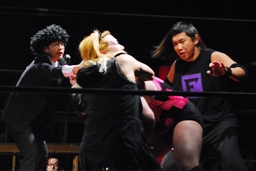 ニラ「アントン、中澤、そこにDDTのエースがいる。まずHARASHIMAを3人で協力して倒そう。」アントン、マイケルも意見が一致。HARASHIMAをコーナーに振って串刺し攻撃連発(左写真)、マイケルにはカウンターのキック。