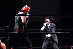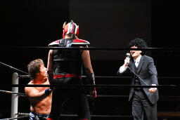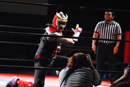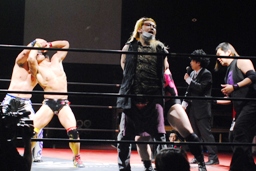 HERO!ポーズを決める(左写真)。しかし松井レフェリーは「部外者の乱入」として之―コンテスト宣告。