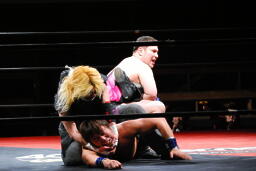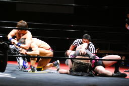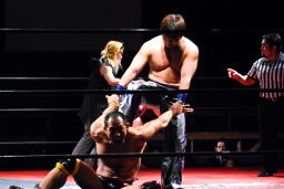 試合は当初の4人で続行。HARASHIMAがマイケルにスリーパーからチキンウィング(左写真)、マイケルロープ。