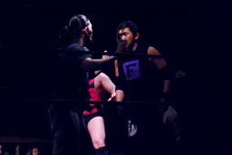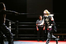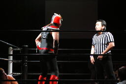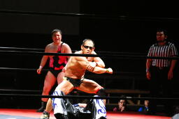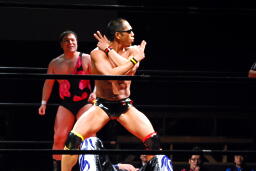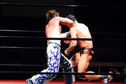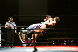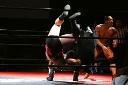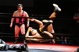 マイケルがバックフリップ狙うがHARASHIMAは背後に着地してリバースフランケンシュタイナー(左写真)、そして蒼魔刀の体勢に。
