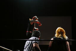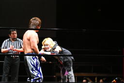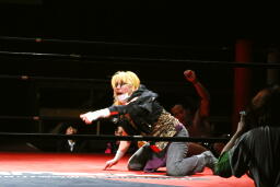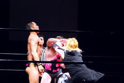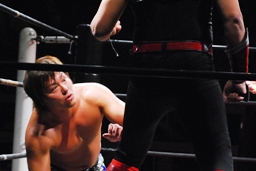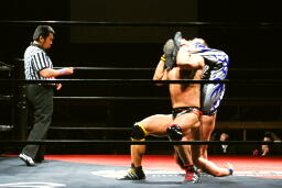 ニラが突然場外に出る。レフェリーとHARASHIMAが気を取られる、マイケル急所打ち(右写真)。