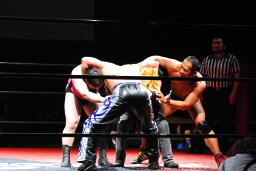 アントンとニラはダブルのブレーンバスター狙う、HARASHIMAブロック。マイケル参加したいがどう入っていいかがわからない(右写真)。