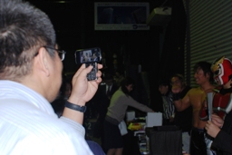 ルールはイリミネーション方式で1人勝ち残るまで。しかし4wayマッチのはずなのにリング上にはHARASHIMA、アントン、マイケル、ニラ、そして藤田ミノルの5人が(右写真)。松井さんはノーチェックで試合を開始。