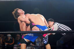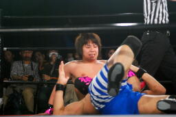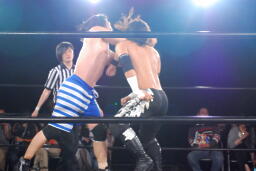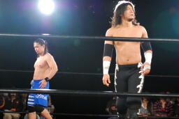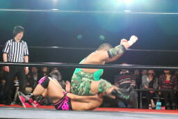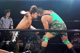 佐々木バック取る、彰人切り返すが佐々木は下からアームロック(左写真)、ワキ固めに。立ち上がって腕をひねる、彰人ガットショット、切り返してハンマーロックに。佐々木切り返してヘッドロックからフライングメイヤー、彰人ヘッドシザーズでブレーク。両軍タッチ。