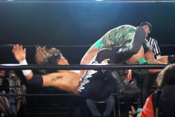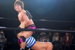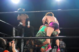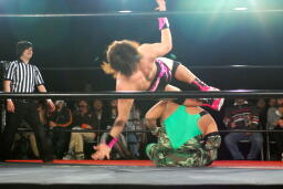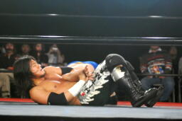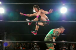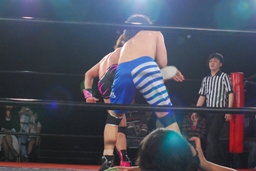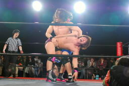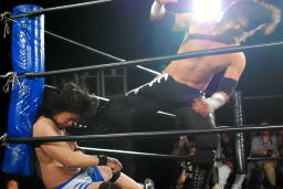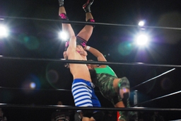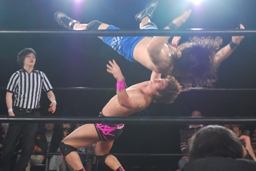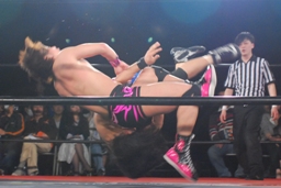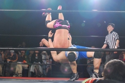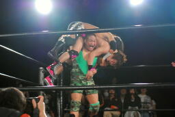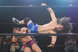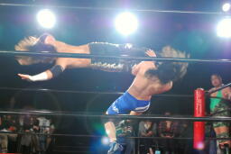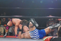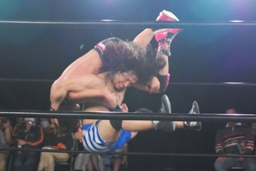投げっ放しジャーマン(右写真)、片エビでカバー、入江がカット。佐々木が入江を場外に落としプランチャ。