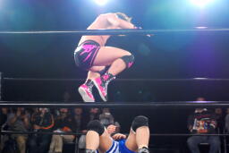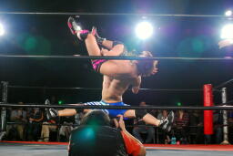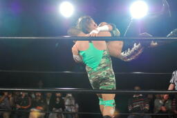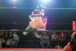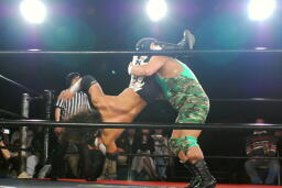 佐々木コーナーに上る、入江も上ってエルボーの打ち合い、佐々木は突き落としてクロスボディ、入江キャッチしてパワースラム(右写真)。両軍タッチ。