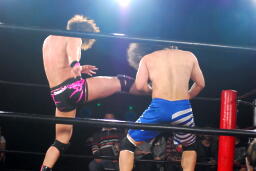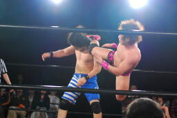 彰人と石井エルボーの打ち合い、彰人ソバット、石井かわして逆にソバット(左写真)、ストンピング、佐々木にタッチ。